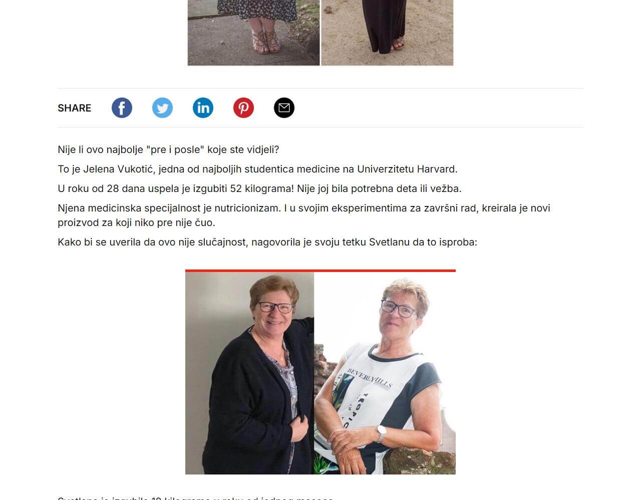 “Nakon menopauze, dobila sam 15 kilograma viška, počela sam da se osjećam odvratno i izgledam isto! Kontaktirala sam nutricionistu koji mi je prepisao SlimMed. Recenzije liječnika, prema njegovim riječima, o ovom lijeku su vrlo pozitivne, a sastav je biljni i siguran. Usudio sam se probati! Ukupno sam završio 2 kursa, po 2 meseca, sa pauzom od 14 dana. Rezultat je neverovatan! Izgubio sam 15 kilograma bez ikakvog napora, apetit mi se normalizovao, ali prije sam bio sklon prejedanju. Koža se takođe zategla, a celulit je postao manje primetan. Pravi eliksir mladosti, ovaj proizvod preporučujem svima!”